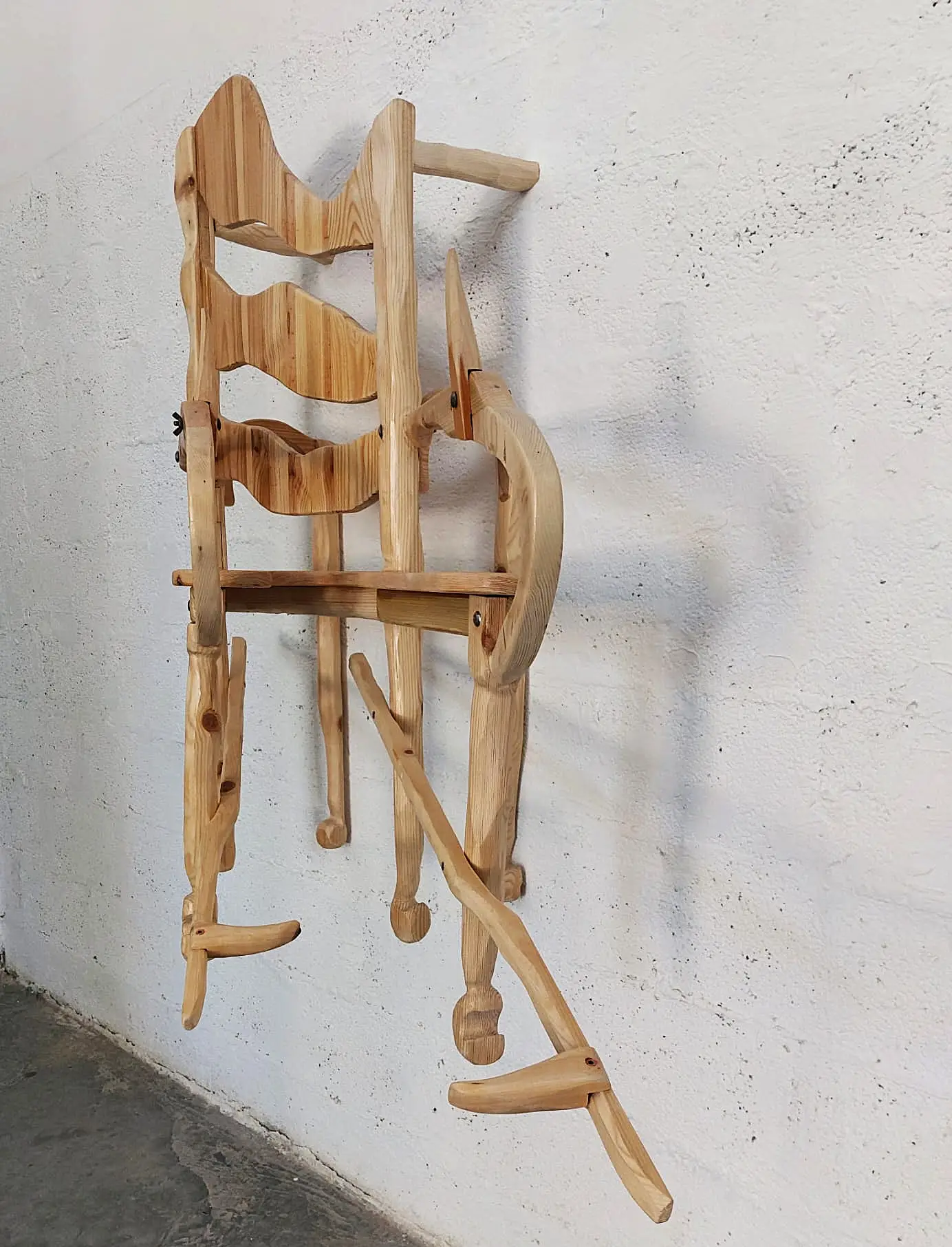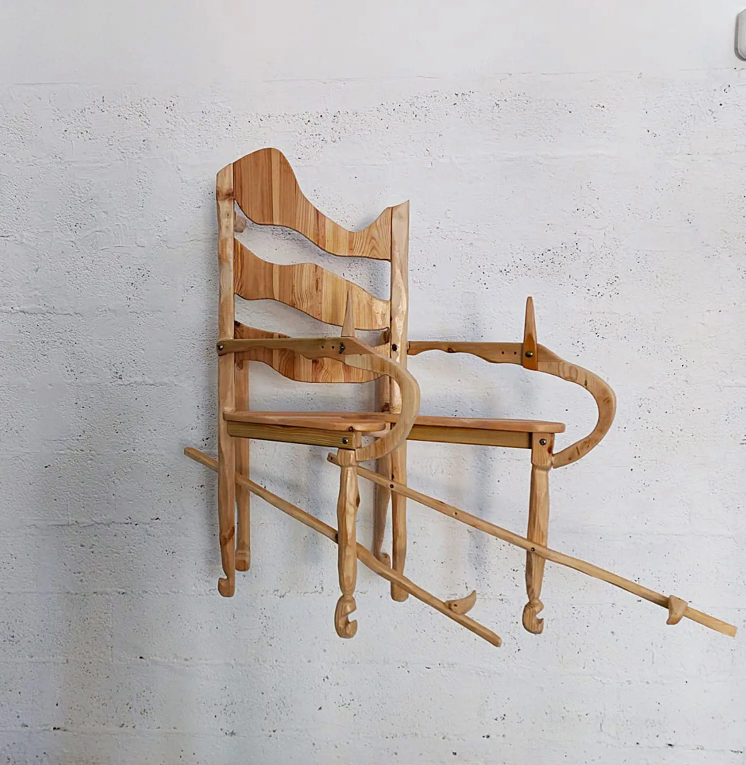 'Mashber' (crisis) is a birth chair whose origins are in the bible. It signified danger, pain and death during the passage of the fetus from the womb on its way out, but also heralded a new life. The chair was inspired by a 'Mashber' chair from the Middle Ages with a conceptual thought about breaking it and taking it out of order Use. The idea of refraction has been translated into the breaking of the perspective and the partial compression of the three-dimensionality in it. A chair that should stably support a mother who twists and turns in a warped axis and disturbed. With wavy, sharp and shaky lines it leads to a new way of thinking.